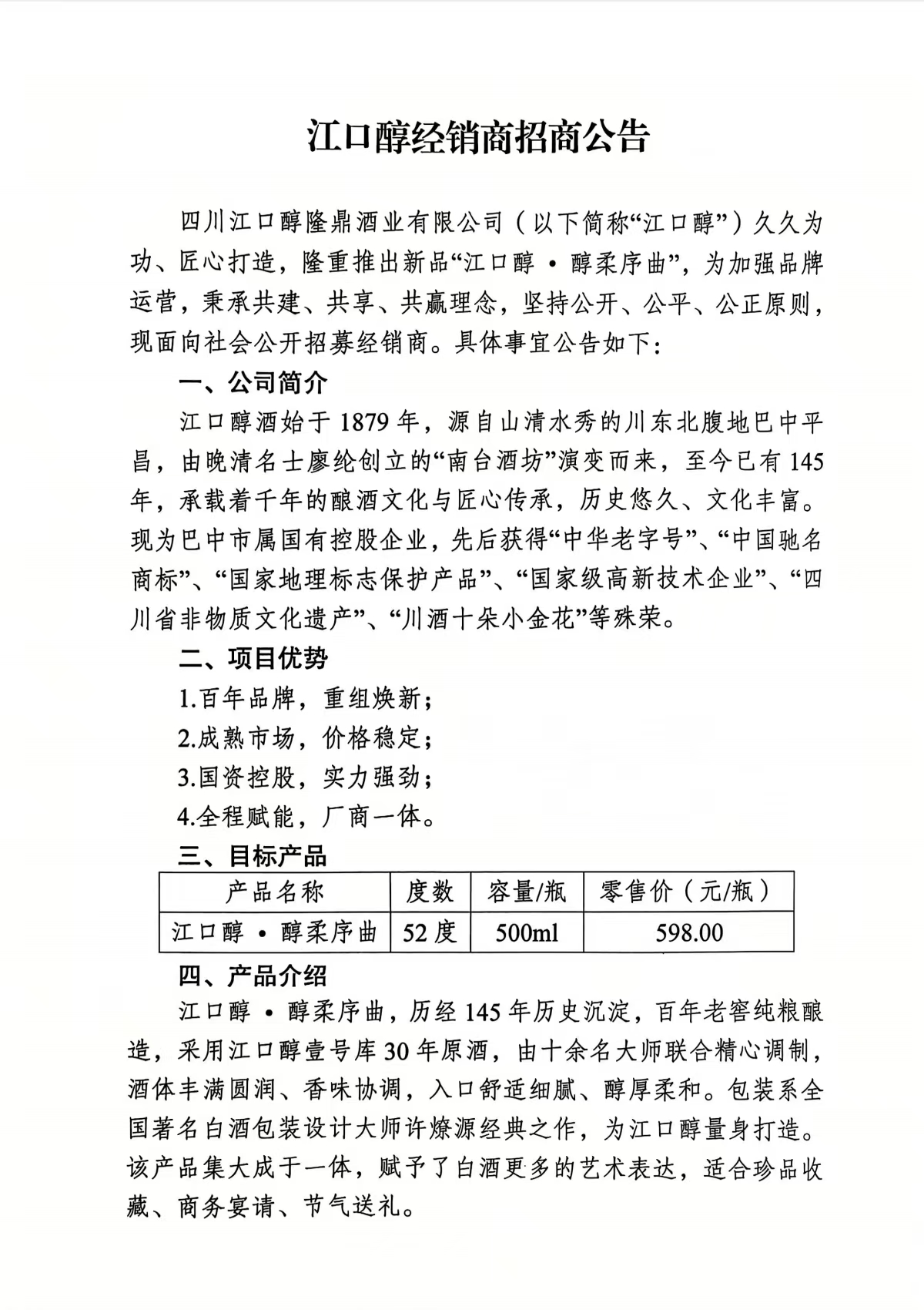 江口醇新品“醇柔序曲”,經(jīng)銷商招商公告!